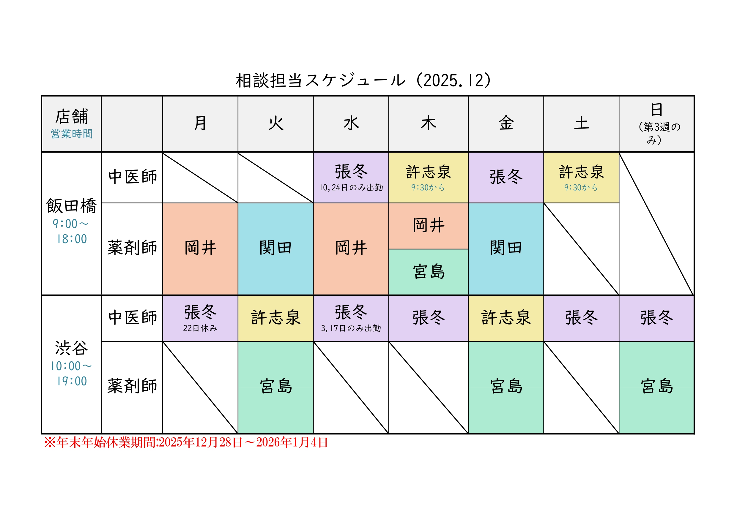 渋谷店:月曜日、第1/3/5水曜日、木曜日、土曜日、日曜日